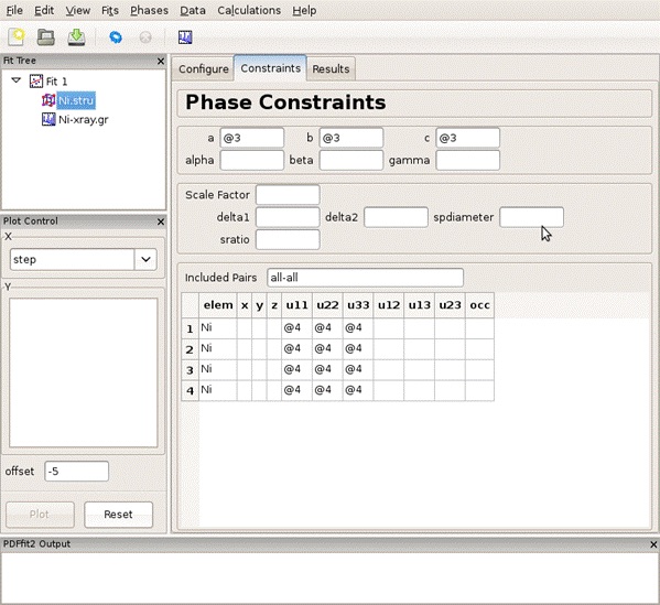 構造モデルおよび測定データ(PDF)の「Constraints」パネルでrefineするパラメータを設定する。