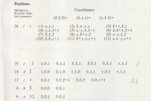 入力された原子位置は、例えばAlの場合、(0, 0, z), (0, 0, -z+1/2), (0, 0, -z), (0, 0, z+1/2)、次に左の4つの座標に+(2/3, 1/3, 1/3)足したもの、次に+(1/3, 2/3, 2/3)を足したものの順に表示される(図9のInternational Tableを参照)。